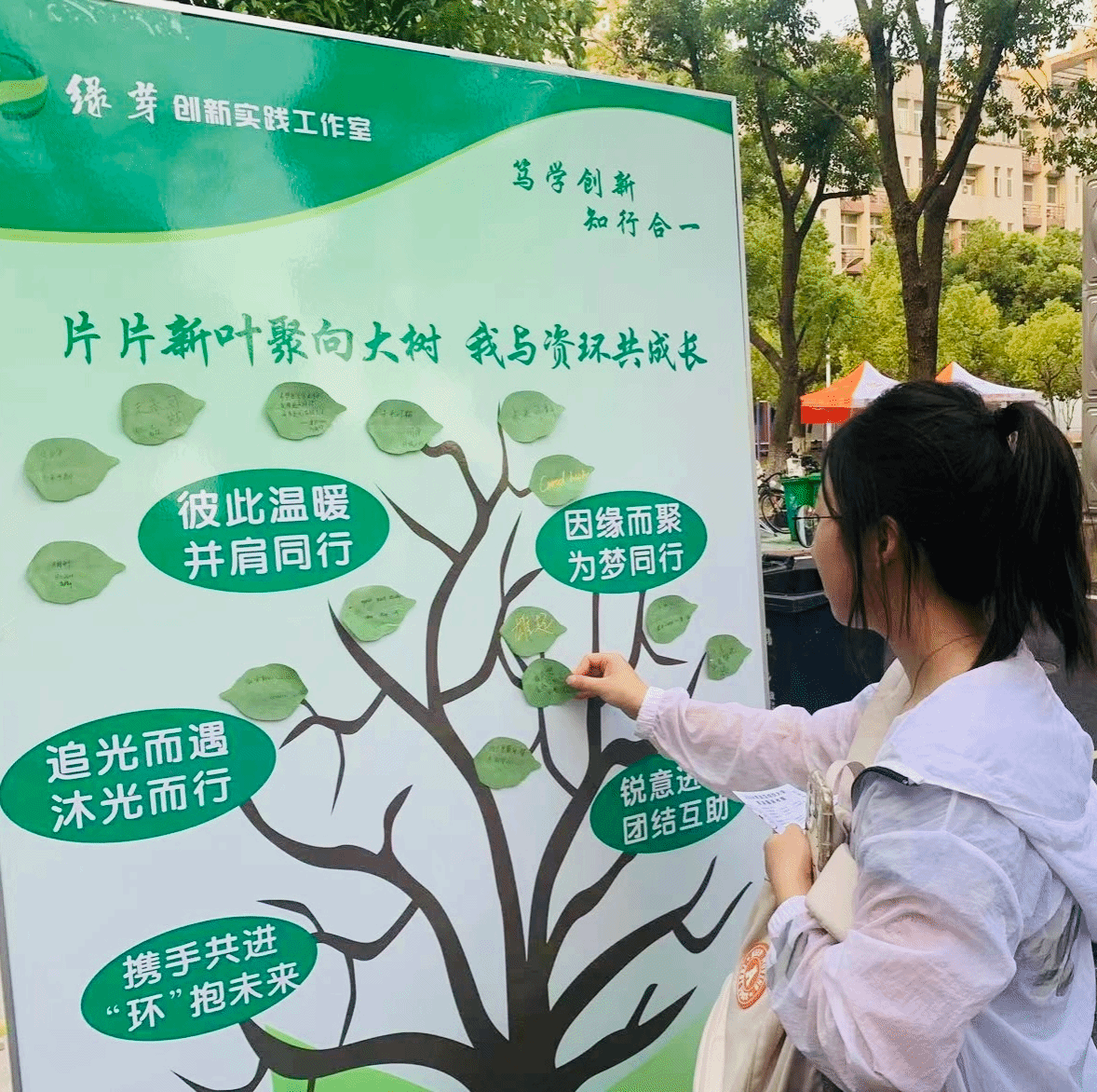 因缘而聚,为梦同行,“新叶心语”的展示牌大树寓意着学院与同学们的关系,“片片新叶聚向大树,我与资环共成长”,新生把写上自己大学的期待与梦想的“绿叶”粘在树干上,寓意新的绿叶加入“资环学院”这棵大树,枝繁叶茂,一起成长。“在资环学院这棵大树上,我将努力汲取养分,让叶更绿,让花更艳,茁壮成长!”环境12404李若男将自己的那片绿叶贴在树干上,十分动容地说。